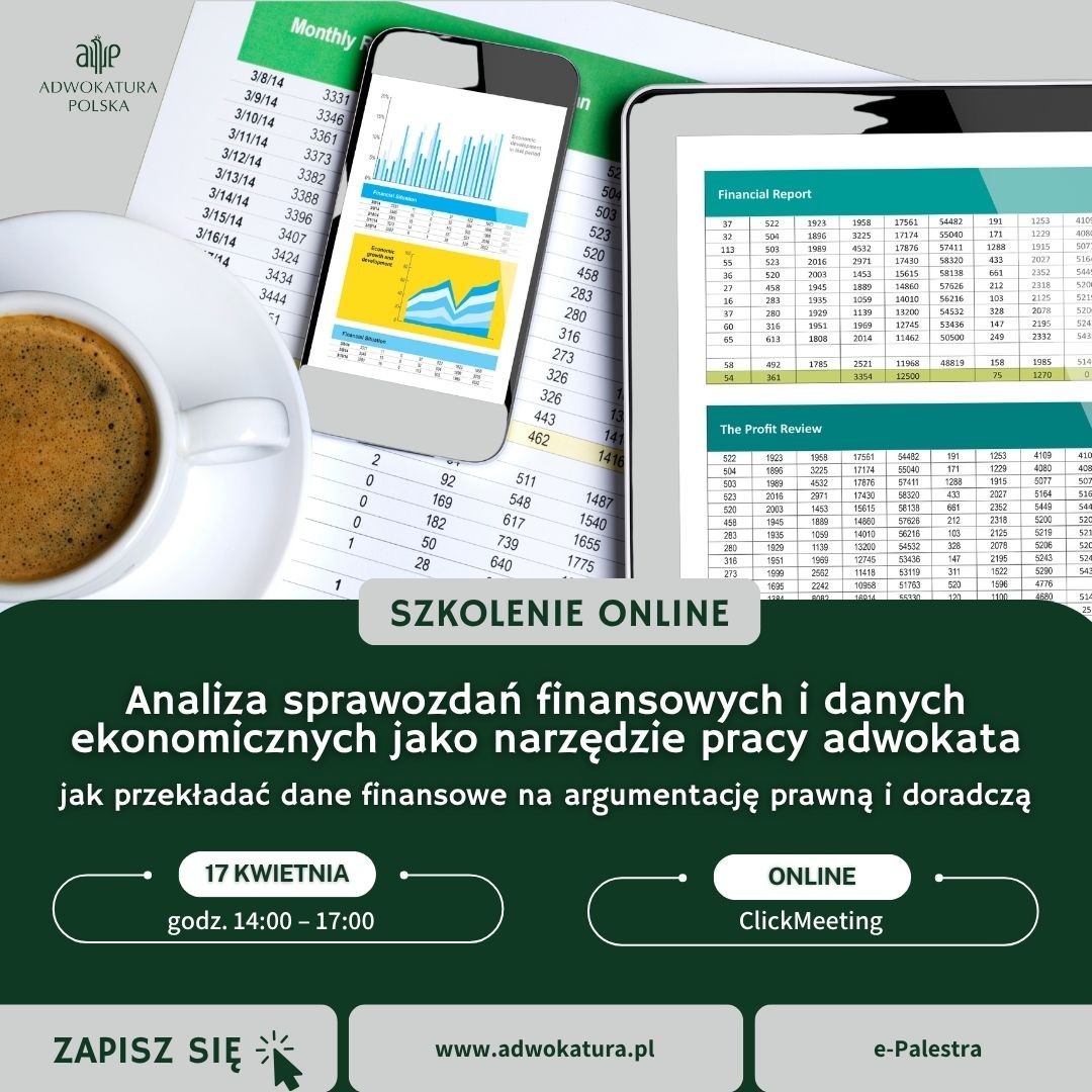 - Komisja Doskonalenia Zawodowego przy Naczelnej Radzie Adwokackiej zaprasza na bezpłatny wykład dla adwokatów i aplikantów adwokackich na temat: „Analiza sprawozdań finansowych i danych ekonomicznych jako narzędzie pracy adwokata - jak przekładać dane finansowe na argumentację prawną i doradczą”.