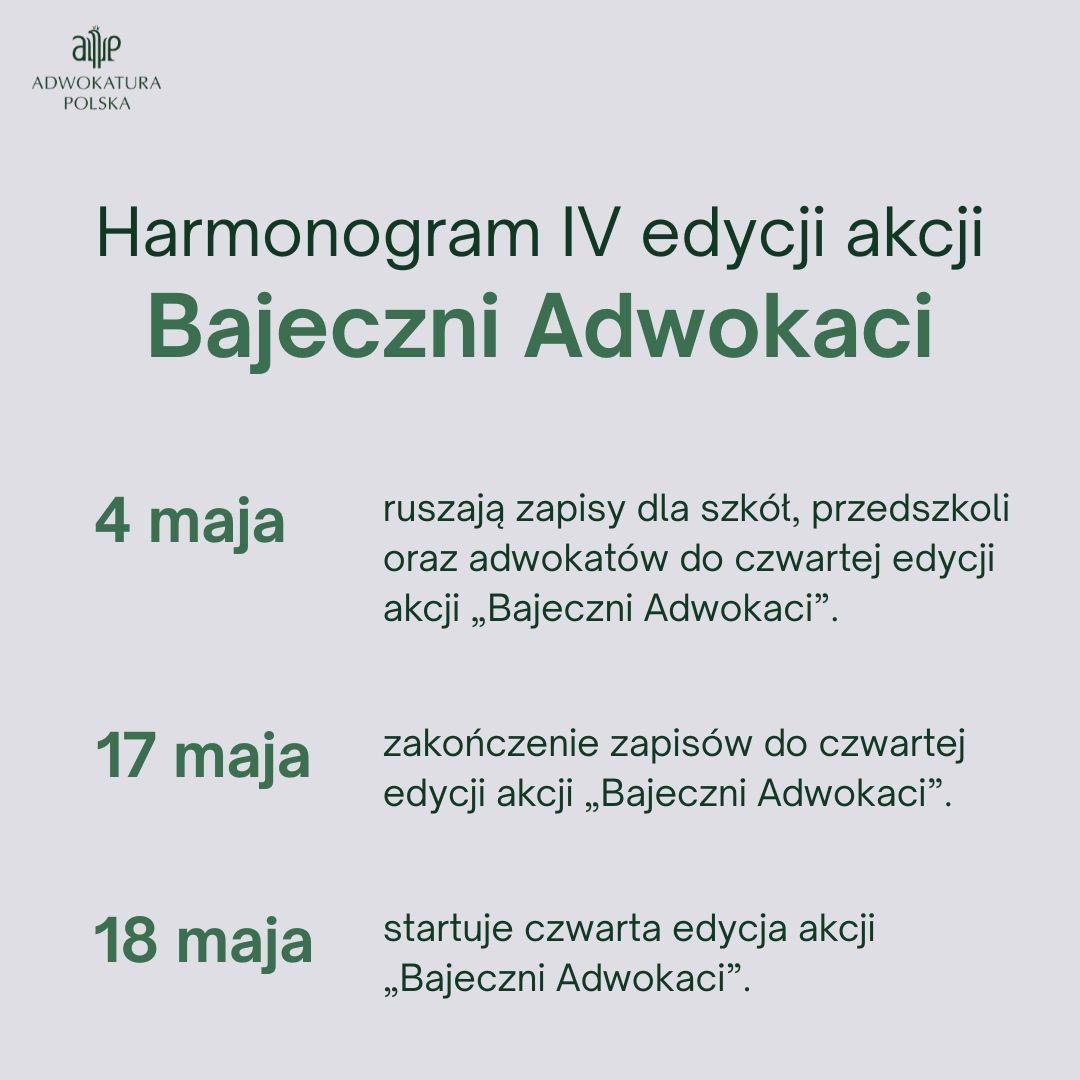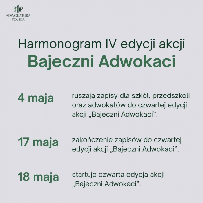 - Start IV edycji akcji zaplanowano na 18 maja 2026 r., a zapisy dla szkół i adwokatów ruszają już 4 maja.
